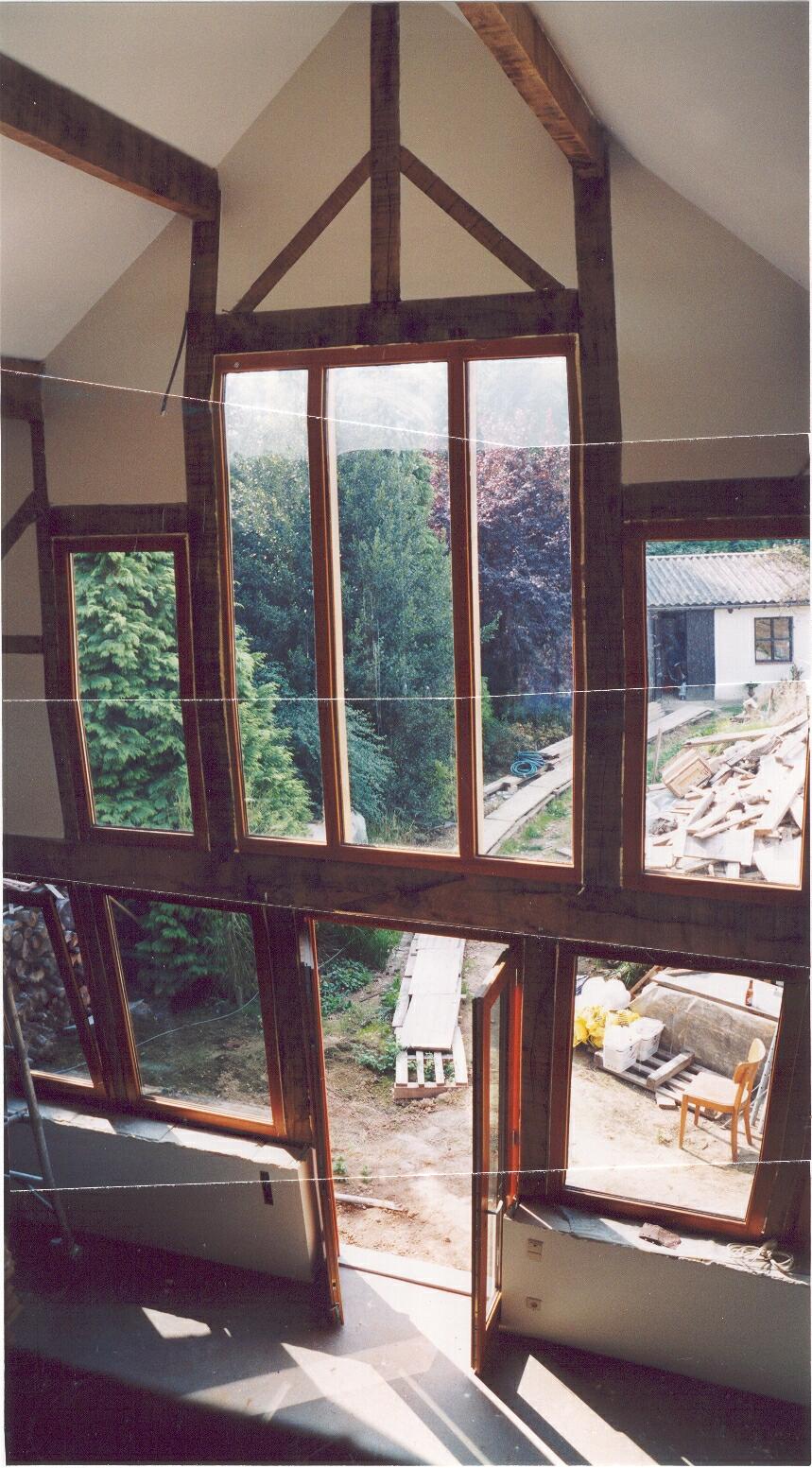 De laatste fase was het plaatsen van de ramen en deuren. Hieronder de achtergevel, en een compositiefoto van binnenuit.